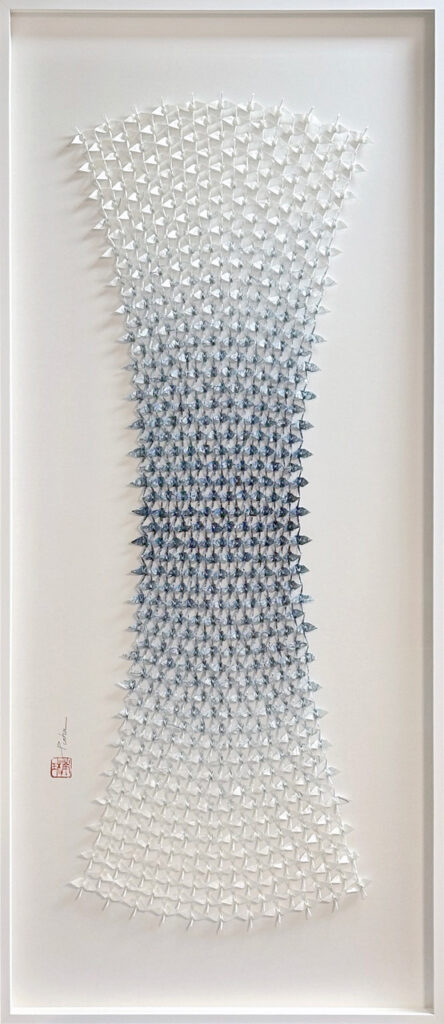 Folded from a single sheet of paper dyed in a gradient from Indigo to white, these 672 connected paper cranes create a diffuse pattern to first center the attention of the viewer and then release it in perfect flow towards the infinite.