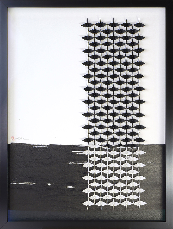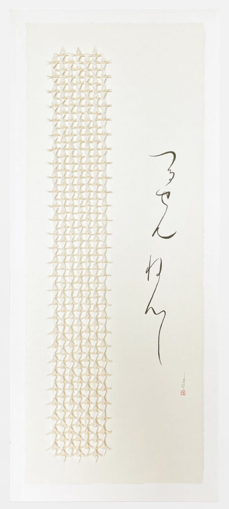 Materials: Creation of the crane folded with a single continuous sheet of Japanese washi paper, mounted on tanzaku board.