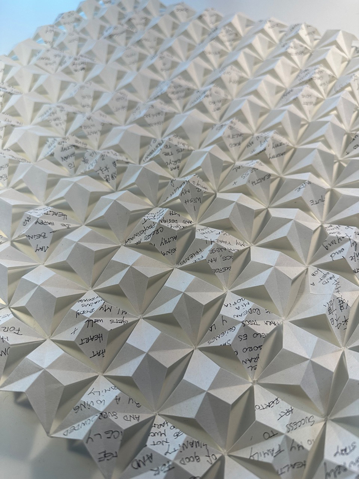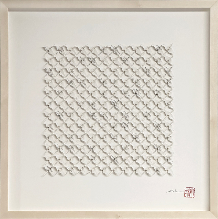 144 paper cranes folded from a single sheet of mulberry paper using the Renzuru paper-folding technique.